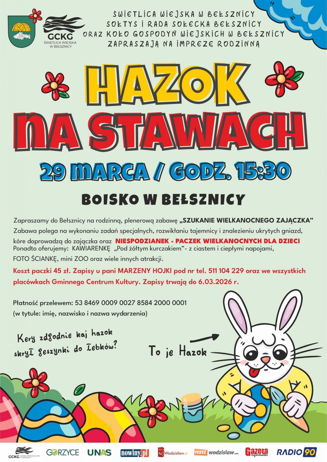 Świetlica Wiejska w Bełsznicy, Sołtys i Rada Sołecka Bełsznicy oraz Koło Gospodyń Wiejskich w Bełsznicy zapraszają na kolejną edycję uwielbianej przez dzieci imprezy HAZOK na Stawach! - 29 marca 2026 r., godzina 15:30, Boisko w Bełsznicy