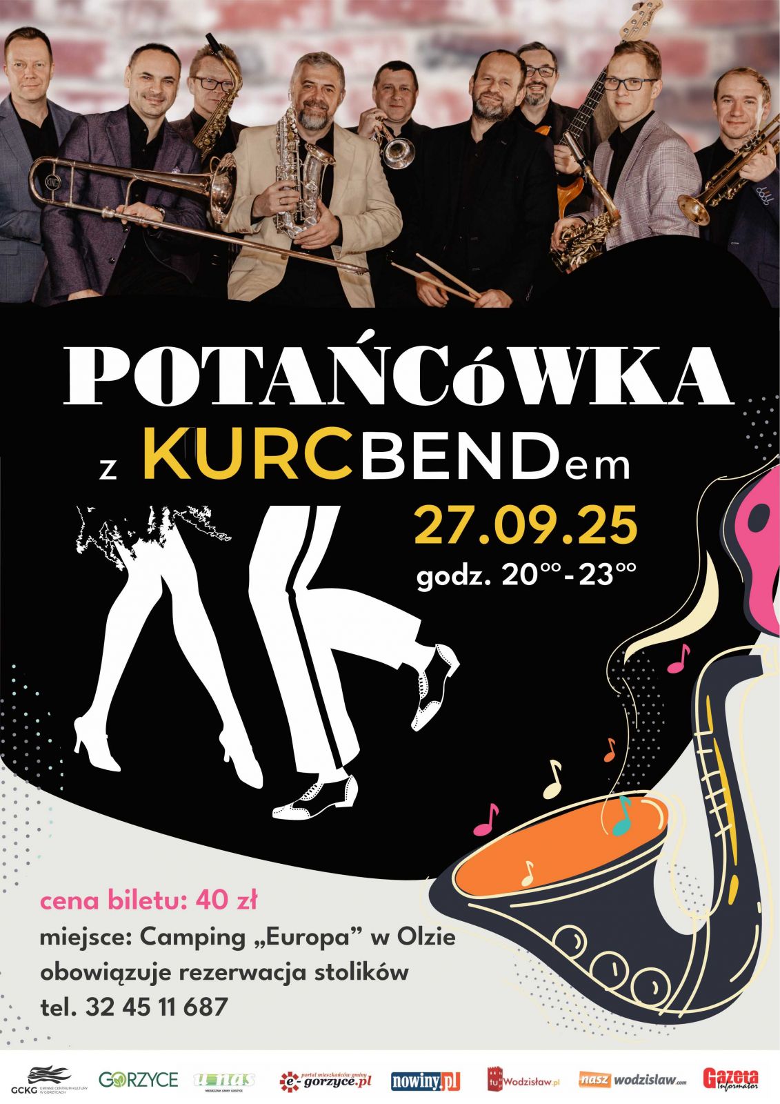 Gminne Centrum Kultury w Gorzycach zaprasza na potańcówkę z Kurcbendem, która odbędzie się 27 września 2025 r., w godzinach: 20:00 - 23:00, w ośrodku Camping „Europa” w Olzie. Cena biletu to 40 zł. Rezerwacji stolików można dokonać pod numerem telefonu: 32 45 11 687.