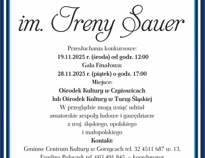 Przesłuchania odbędą się 19 listopada br. (środa) od godz. 12:00 w Ośrodku Kultury w Czyżowicach (Strażacka 8, 44-352 Czyżowice) bądź Ośrodku Kultury w Turzy Śląskiej (Bogumińska 17, 44-351 Turza Śląska) w 2 kategoriach: