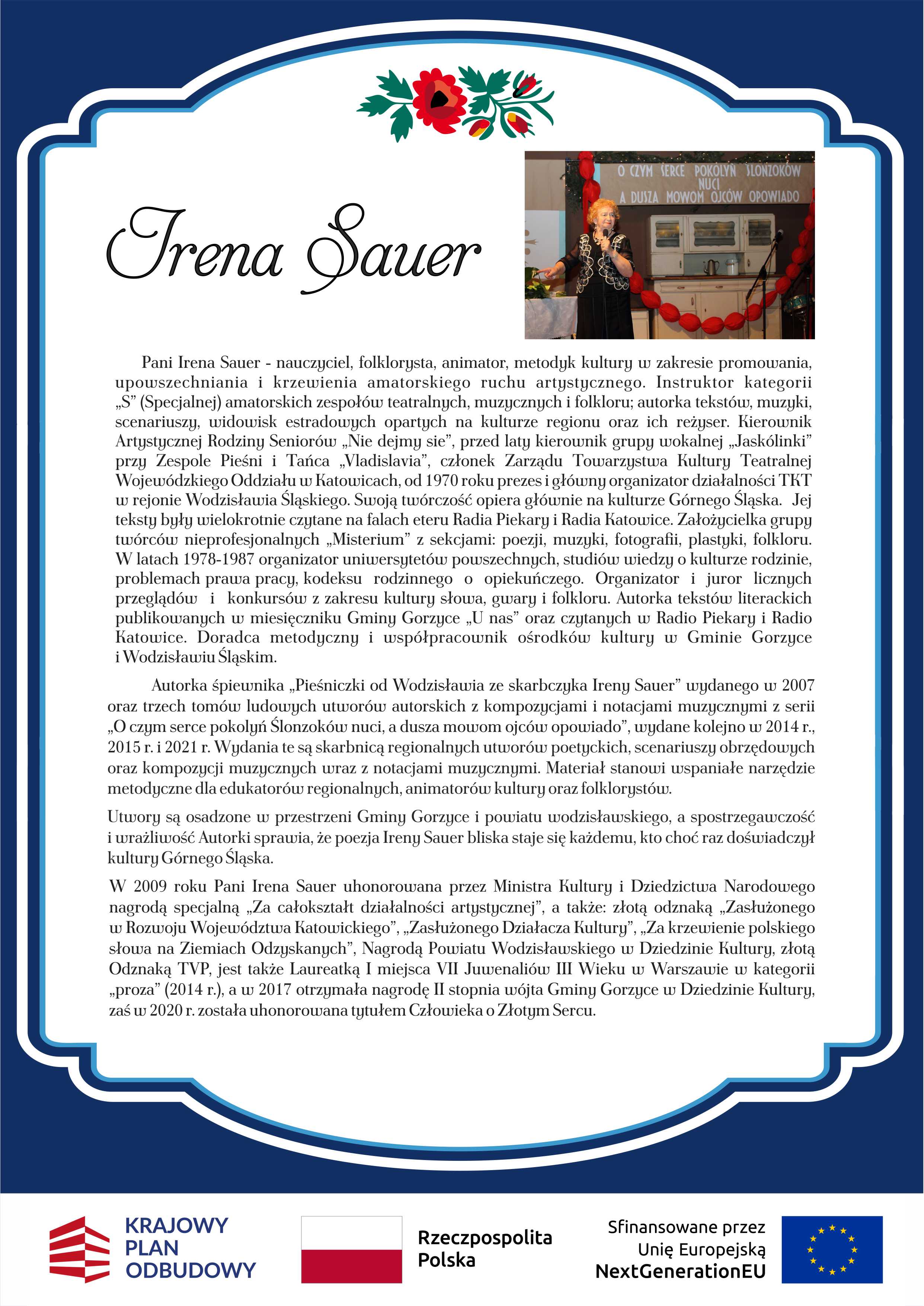 Irena Sauer to ważna postać dla naszej lokalnej społeczności - była artystką, poetką, działaczką, której twórczość obejmuje opowieści o tradycjach, wiersze, gawędy oraz pieśni śpiewane w gwarze śląskiej. Stąd narodził się pomysł na stworzenie wydarzenia, które będzie uhonorowaniem dorobku p. Ireny oraz pozwoli poznać jej utwory większemu gronu odbiorców.