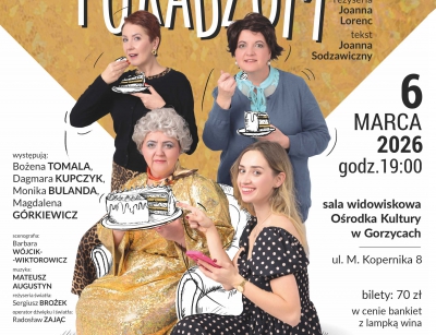 Spektakl odbędzie się w 6 marca 2026 r. o godz. 19:00 na sali widowiskowej Ośrodka Kultury w Gorzycach. W cenie biletu (70 zł) - bankiet z lampką wina. Rezerwacja biletów - Ośrodek Kultury w Gorzycach, tel: 32 4511 687 wew. 13.
