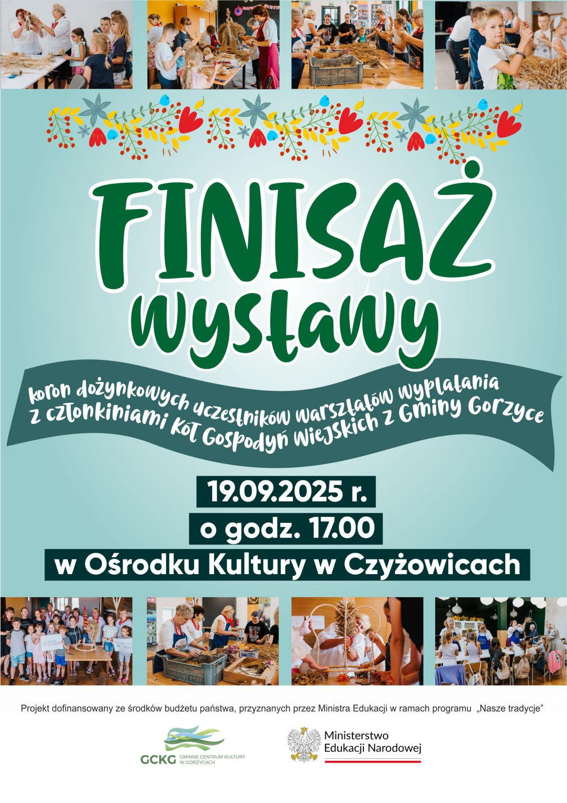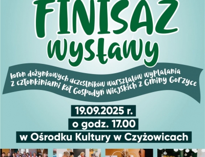 Gminne Centrum Kultury w Gorzycach zaprasza na finisaż wystawy koron dożynkowych uczestników warsztatów wyplatania z członkiniami Kół Gospodyń Wiejskich z Gminy Gorzyce, który odbędzie się w dniu 19.09.2025 r. o godzinie 17.00 w Ośrodku Kultury w Czyżowicach. Jest to podsumowanie projektu finansowanego przez Ministra Edukacji w ramach programu "Nasze tradycje".