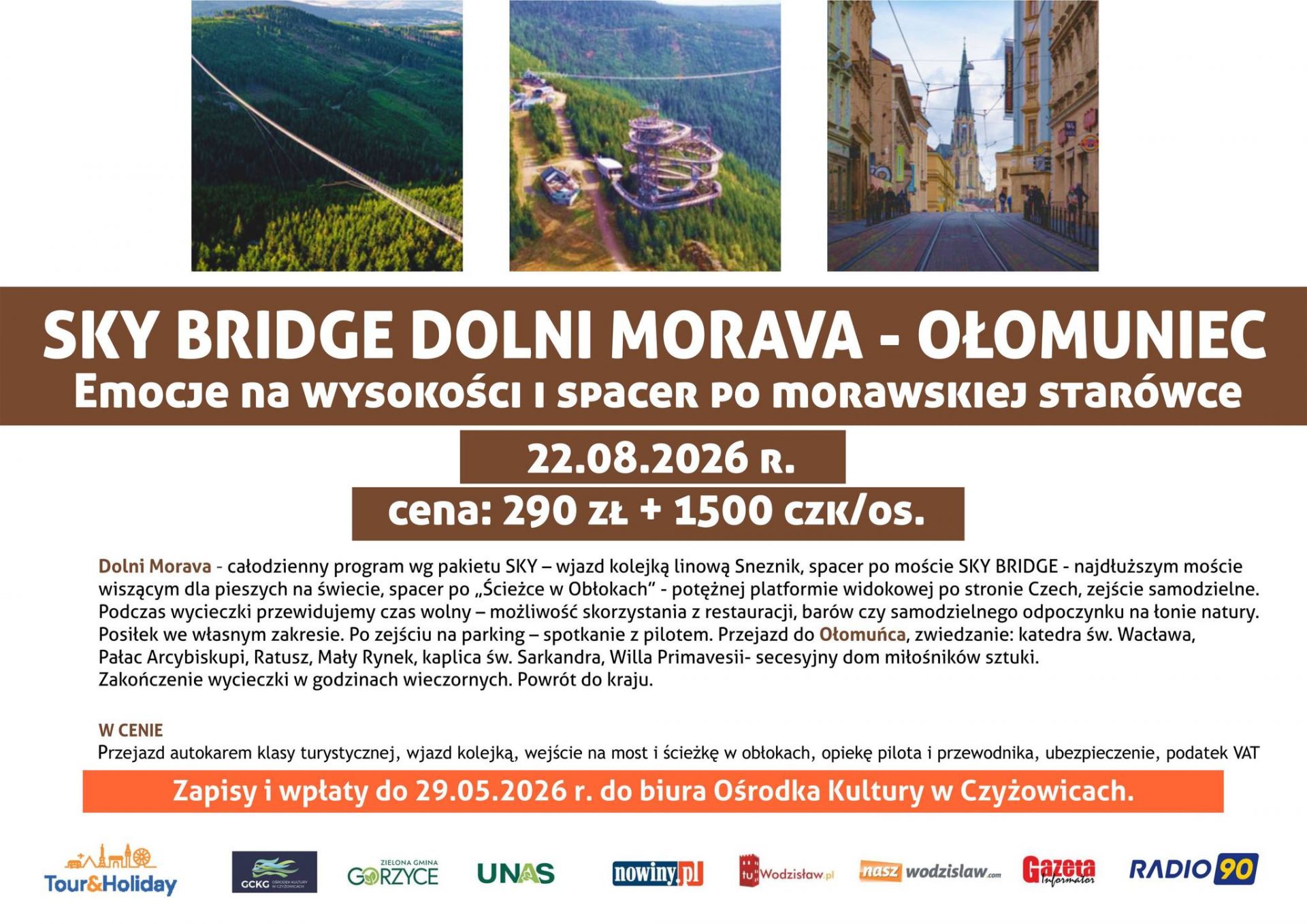 Sky Bridge Dolni Morava - Ołomuniec - emocje na wysokości i spacer po morawskiej starówce - 22.08.2026 r., cena: 290 zł + 1500 CZK/os.