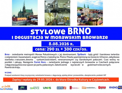 1. Stylowe Brno i degustacja w morawskim browarze - 8.08.2026 r., cena: 290 zł + 300 CZK/os.