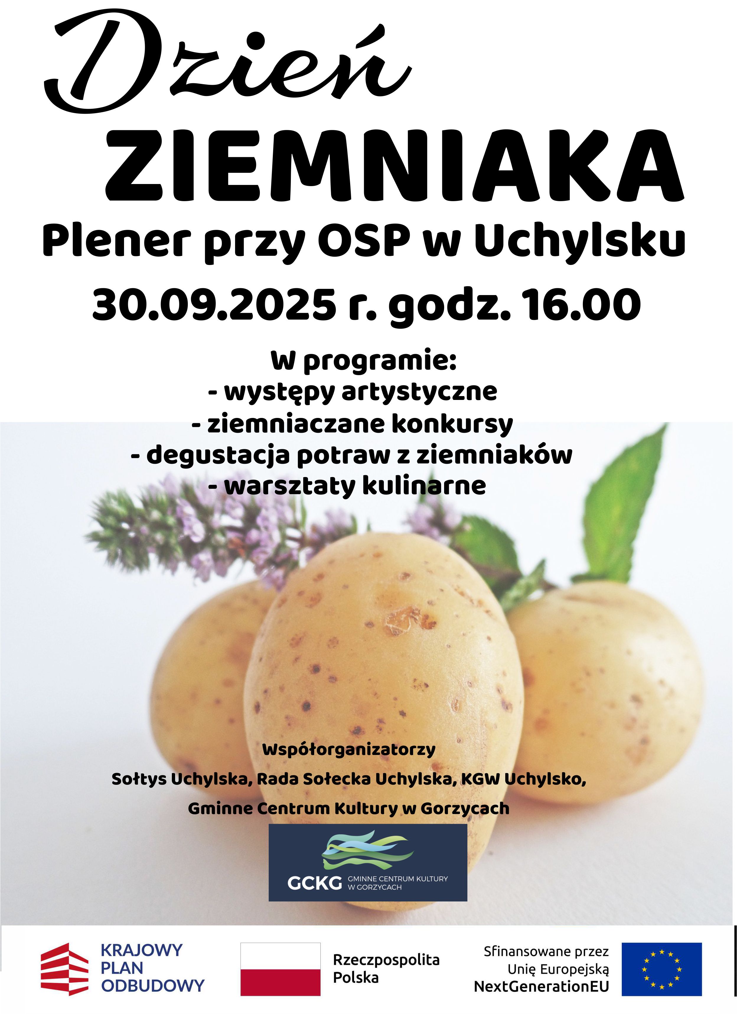 Gminne Centrum Kultury w Gorzycach, Sołtys Uchylska, Rada Sołecka Uchylska, KGW Uchylsko zapraszają na Dzień Ziemniaka w Uchylsku. Impreza odbędzie się 30.09.2025 r. o godz. 16:00. W programie: występy artystyczne, ziemniaczane konkursy, degustacja potraw z ziemniaków, warsztaty kulinarne. Wydarzenie sfinansowane jest przez Unię Europejską NextGenerationEU oraz Krajowy Plan Odbudowy w ramach projektu "NASZA STARKA ŁOD GOŁKOWIC PRZIJECHALI DO CZYŻOWIC"... ŻYWE, ŚLĄSKIE TRADYCJE GMINY GORZYCE.