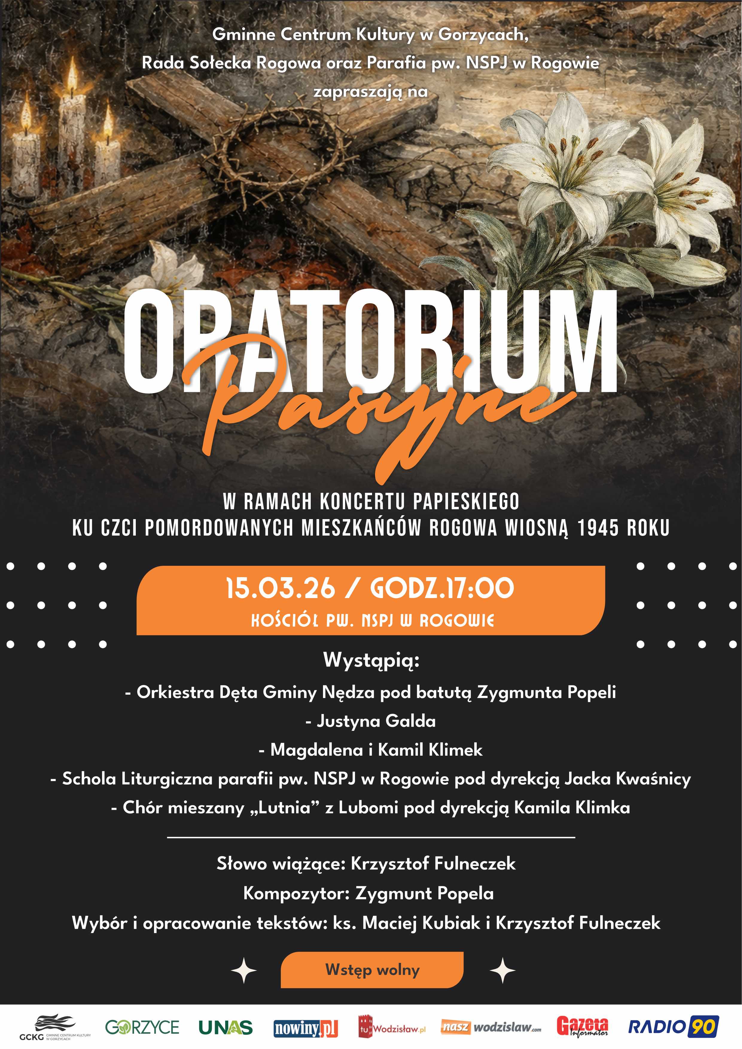 Gminne Centrum Kultury w Gorzycach, Rada Sołecka Rogowa oraz Parafia pw. NSPJ w Rogowie zapraszają na Oratorium Pasyjne - w ramach koncertu papieskiego ku czci pomordowanych mieszkańców Rogowa wiosną 1945 roku.