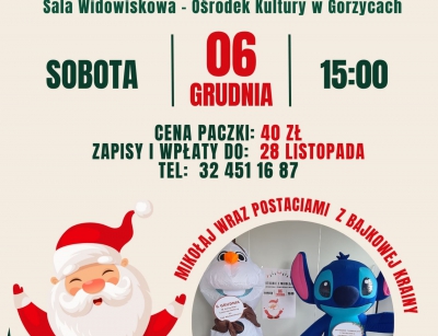 Gminne Centrum Kultury w Gorzycach serdecznie zaprasza wszystkie dzieci na spotkanie ze Św. Mikołajem oraz jego niezwykłymi pomocnikami - Stichem i bałwankiem Olafem!