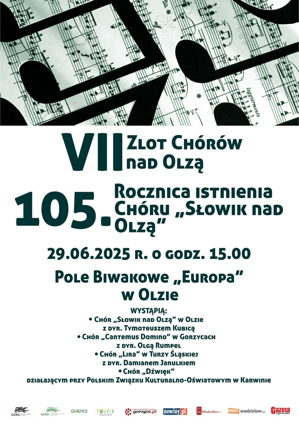 29.06.2025 r., godz.: 15:00 na Polu Biwakowym "Europa" w Olzie odbędzie się VII Zlot Chórów nad Olzą 105. rocznica istnienia Chóru "Słowik nad Olzą".