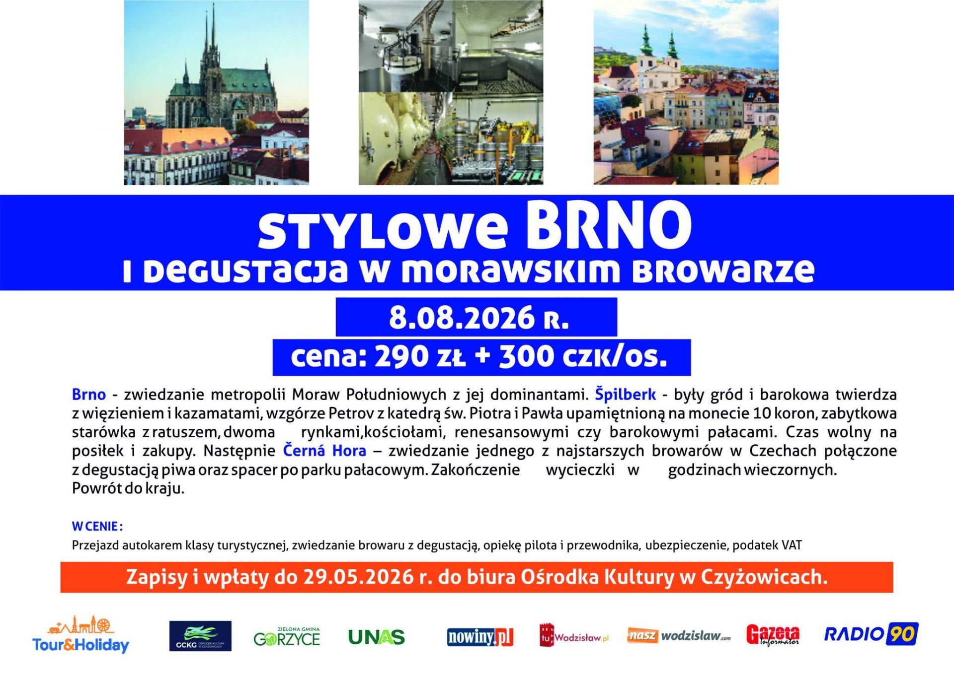 1. Stylowe Brno i degustacja w morawskim browarze - 8.08.2026 r., cena: 290 zł + 300 CZK/os.
