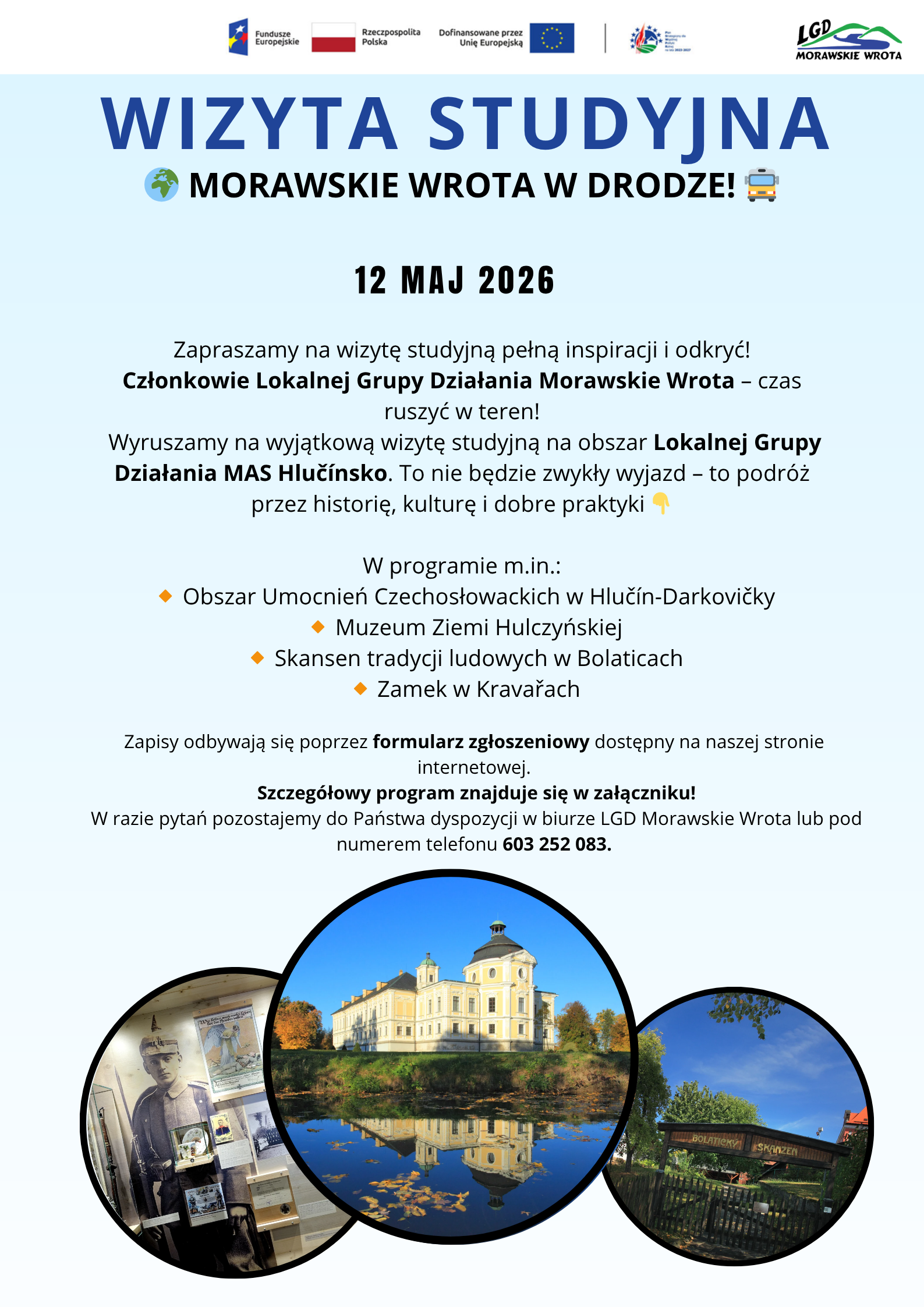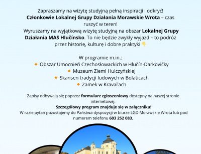 zapraszamy Was na inspirującą wizytę studyjną, która odbędzie się 12 maja br. na obszarze Lokalnej Grupy Działania MAS Hlučínsko. To doskonała okazja, aby zobaczyć w praktyce ciekawe inicjatywy, wymienić doświadczenia oraz zaczerpnąć nowych pomysłów do naszych działań.